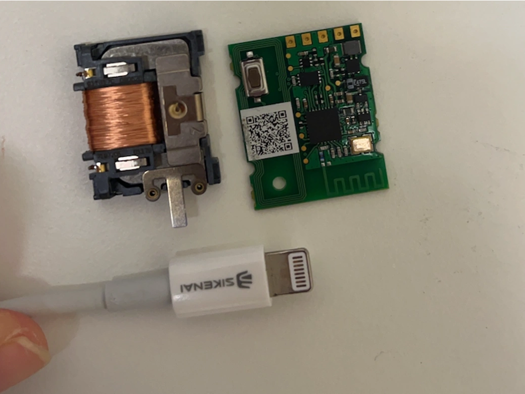 The main components of a Bluetooth self-powered module, including the energy-harvesting coil and the Bluetooth control PCB, which can be customized for various mechanical designs and applications.