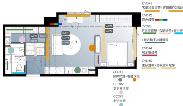 主臥房照明同樣採用無電開關與 BFi53CVD 恆壓調光控制器 的組合架構,實現全戶多區域照明的集中化與情境化控制。